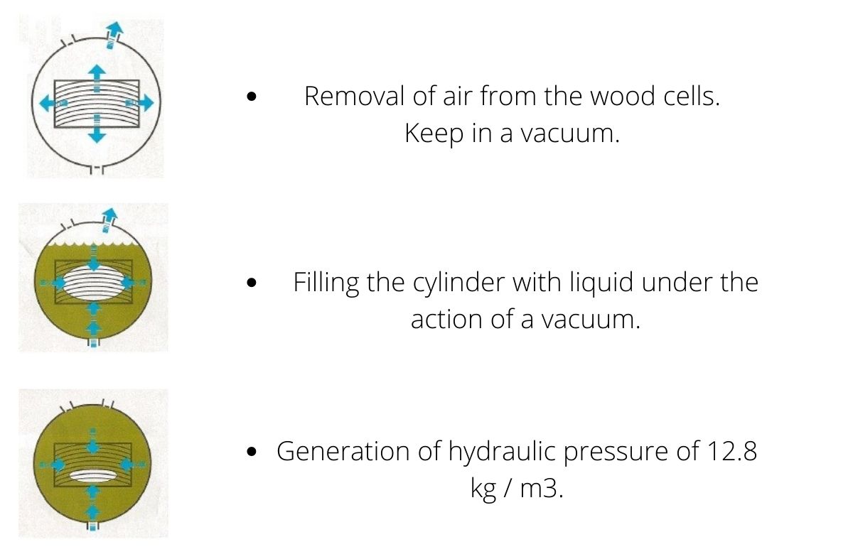 Pressure impregnation consists in protecting the wood against external factors (insects, fungi or bacteria) with the use of specialized chemicals. The process consists in forcing the impregnation into the submicroscopic spaces of the wood.